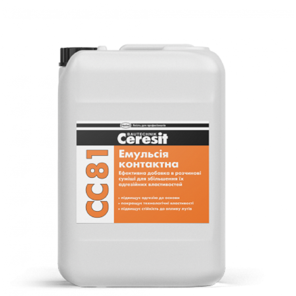Додавання емульсії CERESIT СС 81 в розчини збільшує їх адгезію до основ, покращує технологічні властивості, підвищує еластичність, тріщиностійкість, зменшує усадку, збільшує життєздатність робочого складу.