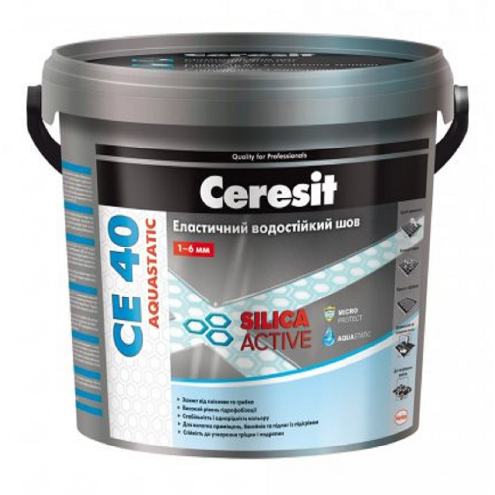 Суміш Ceresit CE 40 Aquastatic з технологією SILICA ACTIVE призначена для затирання швів керамічних, скляних облицювань, а також облицювань з штучного і натурального каменю, в тому числі мармуру, при роботах на горизонтальних і вертикальних поверхнях. Завдяки високому ступеню гідрофобізації затірки (ефект Aquastatic) краплі води стікають з поверхні і не проникають в її структуру. Ця властивість дозволяє використовувати суміш в місцях, схильних до періодичному інтенсивному впливу води (душові, ванні кімнати, кухні, басейни, що знаходяться всередині приміщень і т. Д.). Ефективна при облицюванні на основах, що піддаються деформації: підлоги з підігрівом, плити з стружки і гіпсокартону. Деформаційні шви в облицюванні і місця примикання сантехнічного обладнання до облицювання необхідно заповнити герметиком Ceresit CS 25.