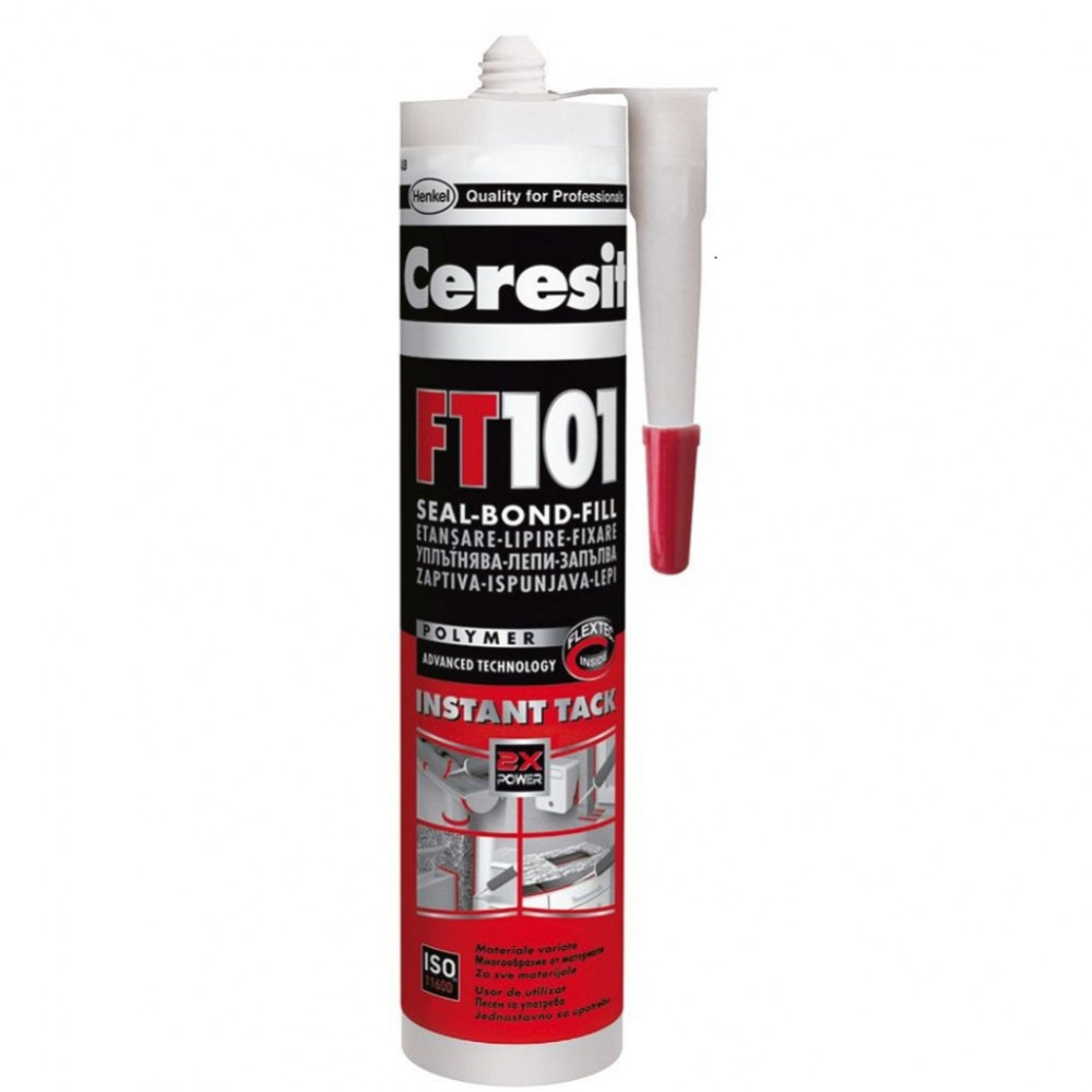 FT 101 Герметик-клей є універсальним однокомпонентним силіконізовані поліуретановим герметиком і клеєм для професійного використання, придатним для герметизації з'єднань, заповнення рухомих тріщин і склеювання майже всіх матеріалів. Може використовуватися всередині і зовні приміщень. Завдяки універсальності не вимагає використання інших герметиків і клеїв. Основою продукту є речовина Flextec ®, твердіння якого відбувається за рахунок реакції з вологою при кімнатній температурі. Ceresit FT 101 має відмінну адгезію до широкого діапазону матеріалів, зокрема натуральному каменю, без застосування грунтовки. Рекомендується використовувати продукт для еластичного склеювання і герметизації в будівництві, наприклад для монтажу підвіконь, плінтусів, ступенів або плитки; допоміжних робіт (склеювання металів, герметизації повітроводів системи вентиляції і кондиціонування повітря і т.п.); стиків в будівельних конструкціях, зазорів між кладкою і віконними рамами, щільних стиків; стиків між готовими будівельними елементами, на зовнішніх балконах і терасах, в металевих і дерев'яних конструкціях. Продукт придатний для використання з багатьма типами матеріалів, такими як бетон, цегла, мармур, плитка, кераміка, фибробетон, оцинкована сталь, чавун, фарбовані метали, лакований алюміній, деревина, меламін і ін. Не придатний для використання на поліетилені, поліпропілені або ПТФЕ .