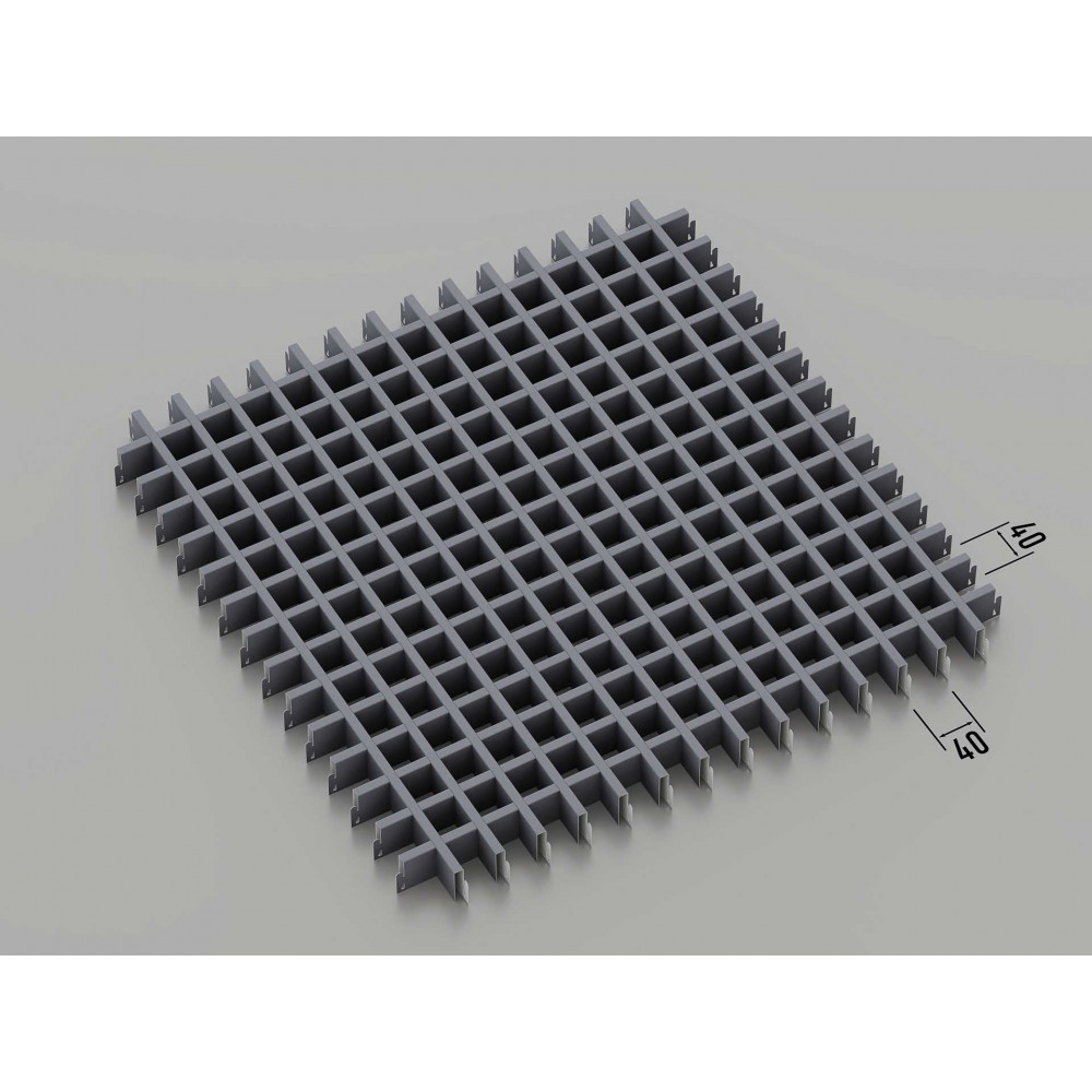 Стеля ГРИЛЬЯТО 40x40 мм класичне RAL 7024, графіт — це стильна і сучасна система підвісних стель, яка ідеально підходить для оформлення офісів, торгових і житлових приміщень. Комірки розміром 40x40 мм виконані з оцинкованої сталі товщиною 0.23-0.25 мм. Також доступний варіант з алюмінію (за запитом). Графітовий колір RAL 7024 надає інтер\'єру сучасний і вишуканий вигляд, що робить цю стелю чудовим вибором для різноманітних приміщень.