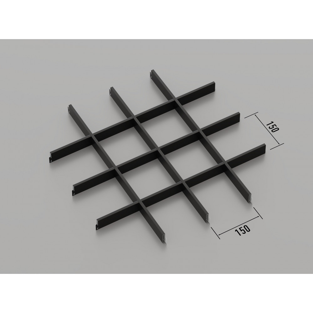 Стеля ГРИЛЬЯТО 150x150 мм класичне, RAL 9005, чорний — це стильна та надійна модульна система підвісних стель, яка ідеально підходить для оформлення сучасних інтер\'єрів. Система з комірками розміром 150x150 мм виготовлена з оцинкованої сталі товщиною 0.23-0.25 мм. За запитом доступна версія з алюмінію товщиною 0.4-0.6 мм. Чорний колір (RAL 9005) надає стелі строгий та елегантний вигляд, роблячи її чудовим вибором для офісних, торгових і житлових приміщень.
