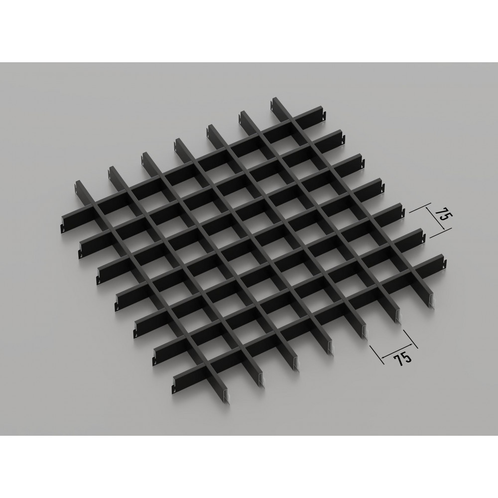Стеля ГРИЛЬЯТО 75x75 мм, класичне, RAL 9005, чорний — це сучасна модульна система підвісних стель, ідеально підходяща для створення стильних і функціональних інтер\'єрів. Панелі з комірками розміром 75x75 мм виготовлені з оцинкованої сталі товщиною 0.23-0.25 мм (за запитом можливий варіант з алюмінію). Чорний колір RAL 9005 надає приміщенню елегантний та строгий вигляд, що робить цю стелю відмінним рішенням для офісних, торгових і житлових просторів.