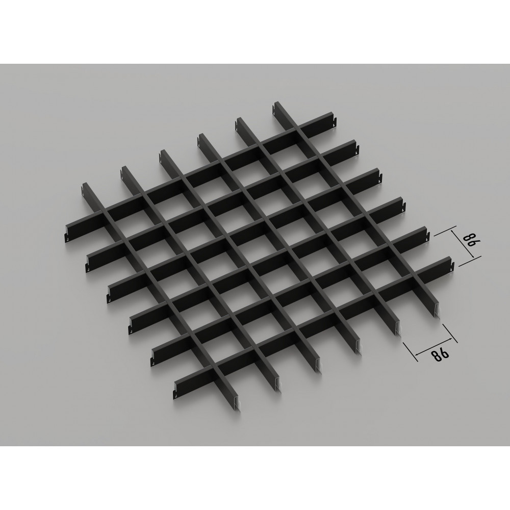 Стеля ГРИЛЬЯТО 86x86 мм класичне, RAL 9005, чорний — це сучасна модульна система підвісних стель, призначена для створення стильних і функціональних інтер\'єрів. Комірки розміром 86x86 мм виконані з міцної оцинкованої сталі товщиною 0.23-0.25 мм, що забезпечує довговічність і стійкість до корозії. За запитом можлива модифікація з алюмінію товщиною до 0.6 мм. Чорний колір (RAL 9005) надає стелі строгий і елегантний вигляд, що робить її ідеальним рішенням для офісів, магазинів, виставкових залів та житлових приміщень.