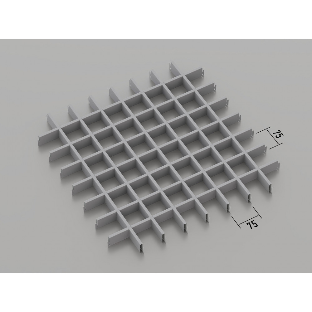Стеля ГРИЛЬЯТО 75x75 мм, класичне, RAL 9006, сірий — це сучасна модульна система підвісних стель, яка ідеально підходить для оформлення різноманітних інтер\'єрів. Плити з комірками розміром 75x75 мм виготовлені з оцинкованої сталі товщиною 0.23-0.25 мм (за запитом доступний варіант з алюмінію), що забезпечує високу міцність і довговічність. Сірий колір (RAL 9006) надає стелі стильного та елегантного вигляду, що робить її відмінним вибором для офісів, торгових залів і житлових приміщень.