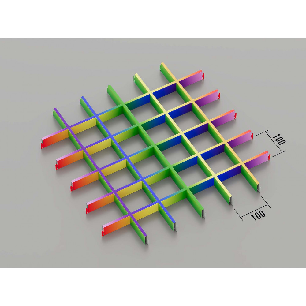 Стеля ГРИЛЬЯТО 100x100 мм класичне RAL на замовлення — це модульна система підвісних стель, яка ідеально підходить для створення стильних і функціональних інтер\'єрів. Осередки розміром 100x100 мм виготовляються з оцинкованої сталі товщиною 0.23-0.25 мм. За запитом можливе виготовлення з алюмінію (0.4-0.6 мм). Доступний будь-який колір за шкалою RAL, що дозволяє адаптувати стелю Grilliato під будь-який дизайн інтер\'єру, будь то офіс, торговий простір чи житлове приміщення.