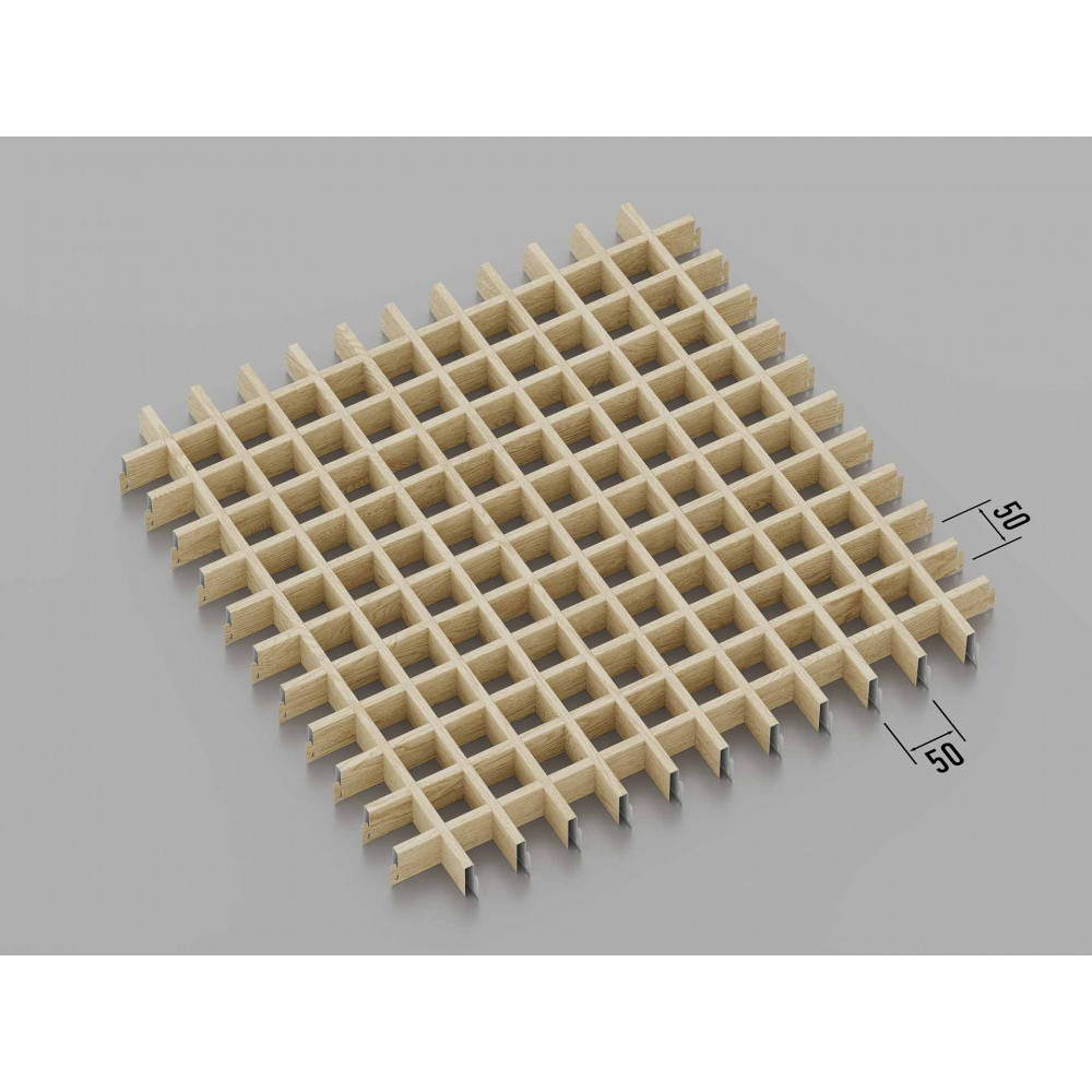 Стеля ГРИЛЬЯТО 50x50 мм, класична, світле дерево призначена для використання в офісних, торгових, ресторанних і житлових приміщеннях. Її натуральний зовнішній вигляд та високі експлуатаційні характеристики роблять її ідеальною для створення комфортних і стильних інтер\'єрів. Коміркова структура стелі сприяє поліпшенню вентиляції та акустики приміщення.