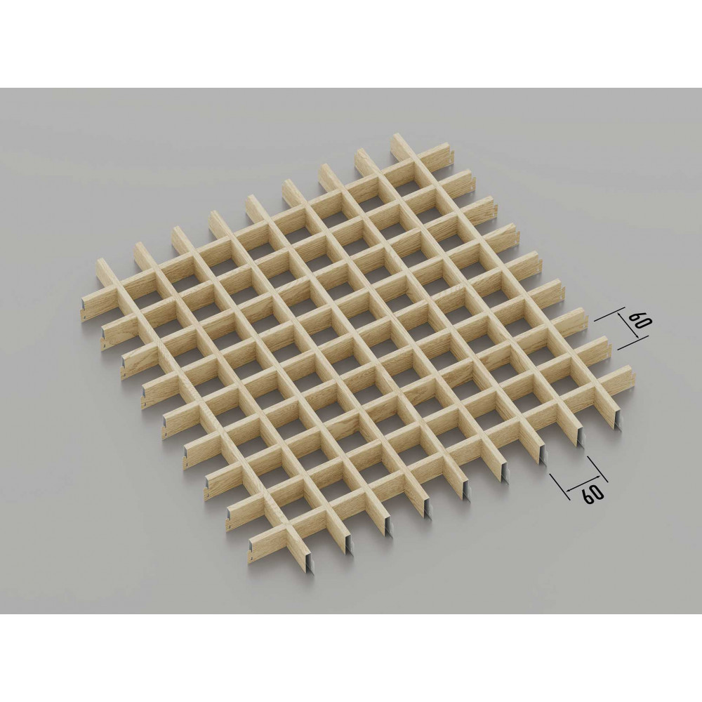 Стеля ГРИЛЬЯТО 60x60 мм, класична, світле дерево — це стильна та функціональна система підвісних стель, створена для оформлення сучасних інтер\'єрів. Поєднання комірок розміром 60x60 мм і оздоблення під світле дерево створює ефект природності та візуального тепла в приміщенні. Виготовлена з оцинкованої сталі товщиною 0.23-0.25 мм, за запитом можливий варіант з алюмінію (0.4-0.6 мм), ця стеля поєднує міцність, довговічність і привабливий зовнішній вигляд. Світле дерево додає м\'якості та елегантності в інтер\'єр.