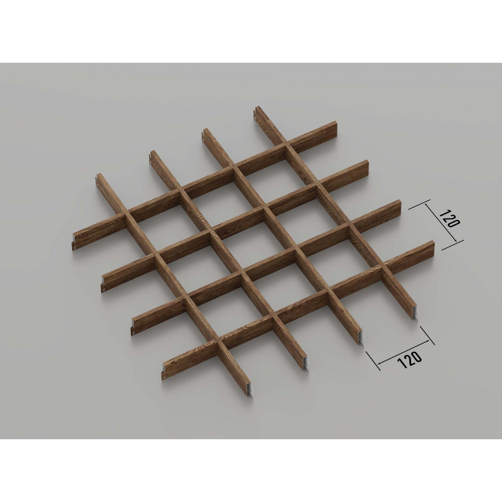 Стеля ГРИЛЬЯТО 120x120 мм класичне темне дерево — це стильна модульна система підвісних стель, яка ідеально підходить для оформлення сучасних інтер\'єрів. Осередки розміром 120x120 мм виготовлені з оцинкованої сталі товщиною 0.23-0.25 мм, за запитом доступний варіант з алюмінію (0.4-0.6 мм). Покриття "темне дерево" надає стелі естетичного і натурального вигляду, що робить її ідеальним вибором для офісних, торгових та житлових приміщень.