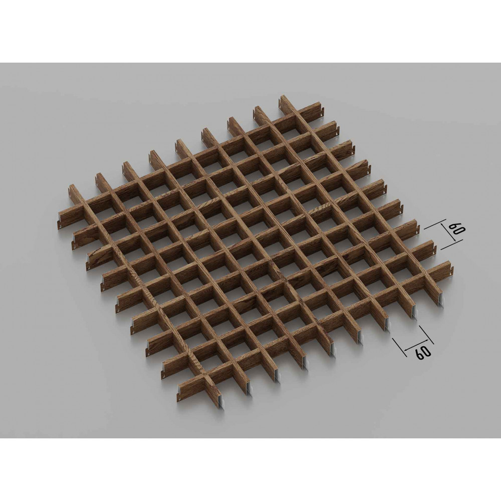 Стеля ГРИЛЬЯТО 60x60 мм, класична, темне дерево — це сучасна модульна система підвісних стель, ідеально підходяща для створення стильних та елегантних інтер\'єрів. Комірки розміром 60x60 мм, виконані з оцинкованої сталі товщиною 0.23-0.25 мм, забезпечують високу міцність і довговічність конструкції. За запитом можливий варіант з алюмінію товщиною 0.4-0.6 мм. Оздоблення під темне дерево додає приміщенню розкоші та затишної атмосфери, роблячи стелю Grilliato відмінним вибором для офісів, магазинів, ресторанів і житлових приміщень.