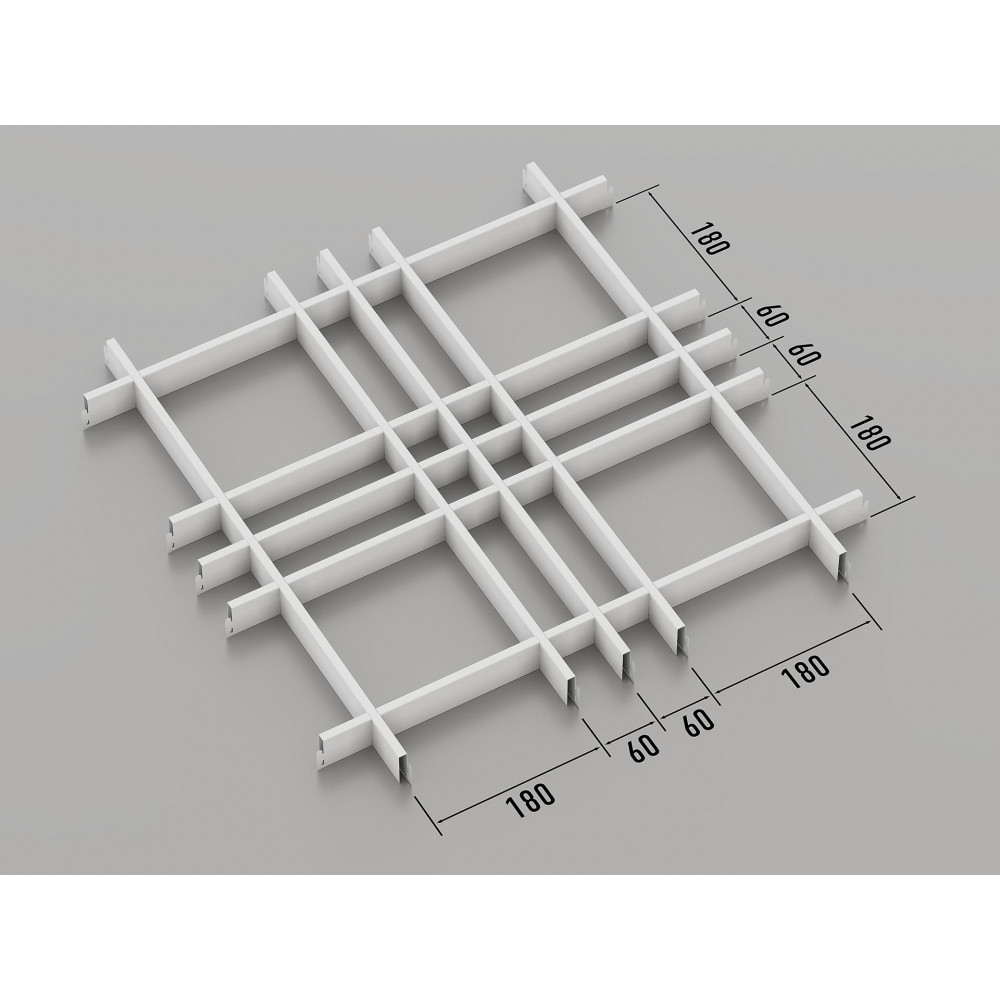 Стеля ГРИЛЬЯТО 180x60 мм, нестандарт, RAL 9003 — це сучасна модульна система підвісних стель, розроблена для стильних та функціональних інтер\'єрів. Панелі з ячейками розміром 180x60 мм, виготовлені з оцинкованої сталі товщиною 0.23-0.25 мм (або алюмінію на замовлення), відрізняються міцністю та довговічністю. Білий колір за шкалою RAL 9003 надає стелі естетичної привабливості, роблячи її ідеальним вибором для офісів, торгових центрів та житлових приміщень.