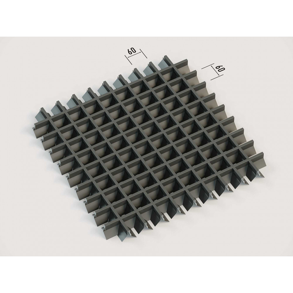 Стеля ГРИЛЬЯТО 60x60 мм, пірамідальне, RAL 9005, чорний, ідеально підходить для офісних і торгових приміщень, таких як магазини, торгові центри, ресторани і кафе. Її сучасний дизайн і функціональні характеристики роблять її чудовим вибором для створення стильних інтер\'єрів у житлових просторах. Пірамідальна форма комірок додає простору глибини і візуального інтересу, що робить цю стелю ідеальною для використання в сучасних інтер\'єрах.