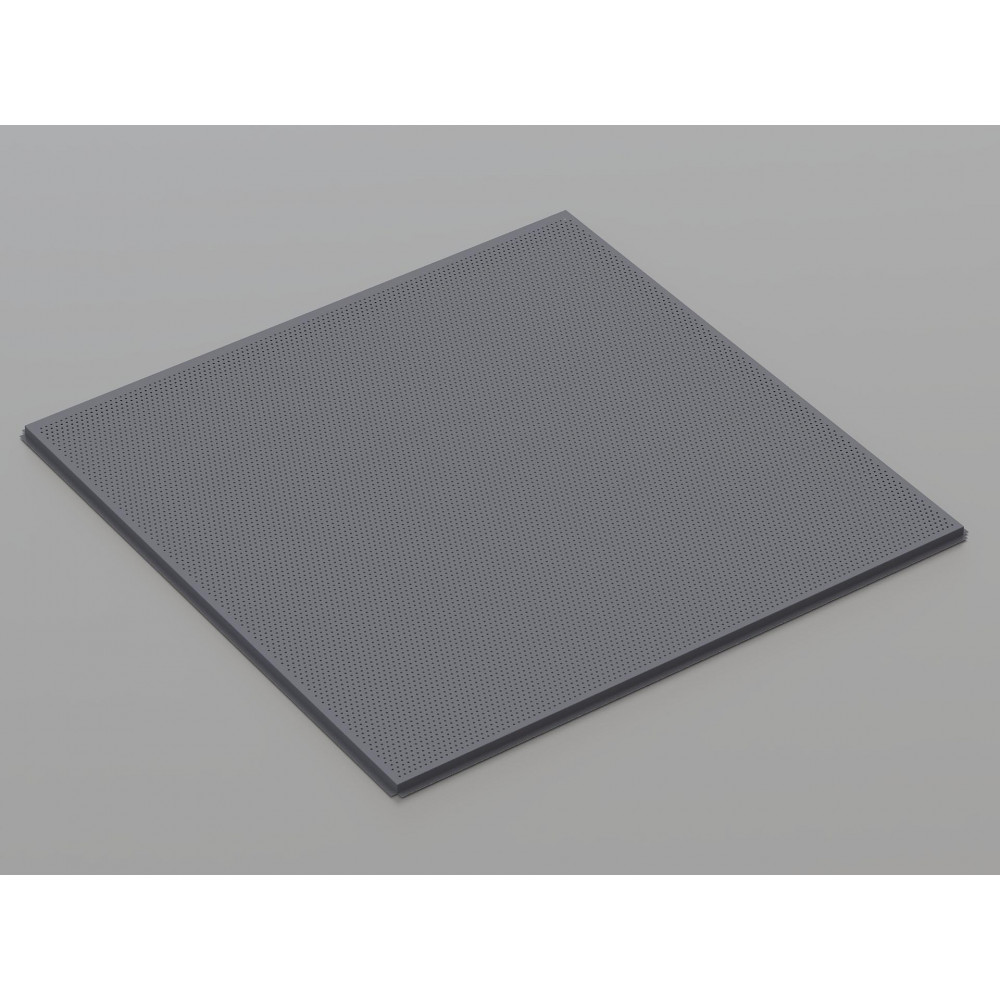 Перфорована металева касета (RAL 7024), кромка — Tegular, 600x600 мм — це сучасне і стильне рішення для підвісних стель, яке поєднується з високими експлуатаційними характеристиками. Касети виготовлені з оцинкованої сталі товщиною 0.23-0.25 мм або алюмінію (за запитом), що забезпечує довговічність і стійкість до корозії. Графітове покриття (RAL 7024) надає приміщенню строгий і елегантний вигляд, а перфорована поверхня покращує вентиляцію і акустику, знижуючи рівень шуму.
