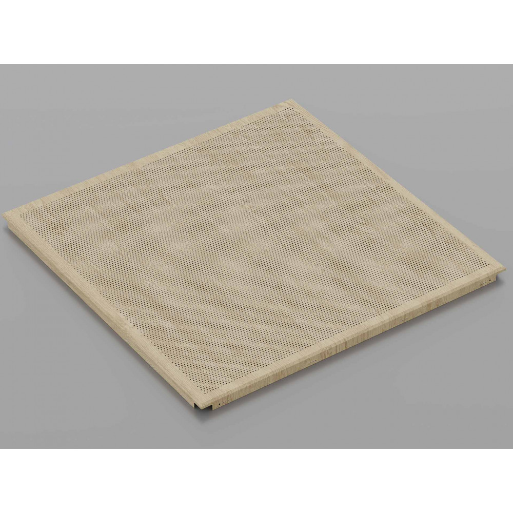 Перфорована металева касета для підвісної стелі з кромкою Clip-In і покриттям "Світле дерево" — це поєднання природної естетики та сучасних технологій. Касети розміром 600x600 мм виготовлені з оцинкованої сталі товщиною 0.23-0.25 мм, з можливістю виготовлення з алюмінію за запитом. Перфорована поверхня забезпечує покращені акустичні характеристики та вентиляцію в приміщенні, а текстура світлого дерева надає стелі натуральний і затишний вигляд, створюючи теплу атмосферу в будь-якому інтер\'єрі.