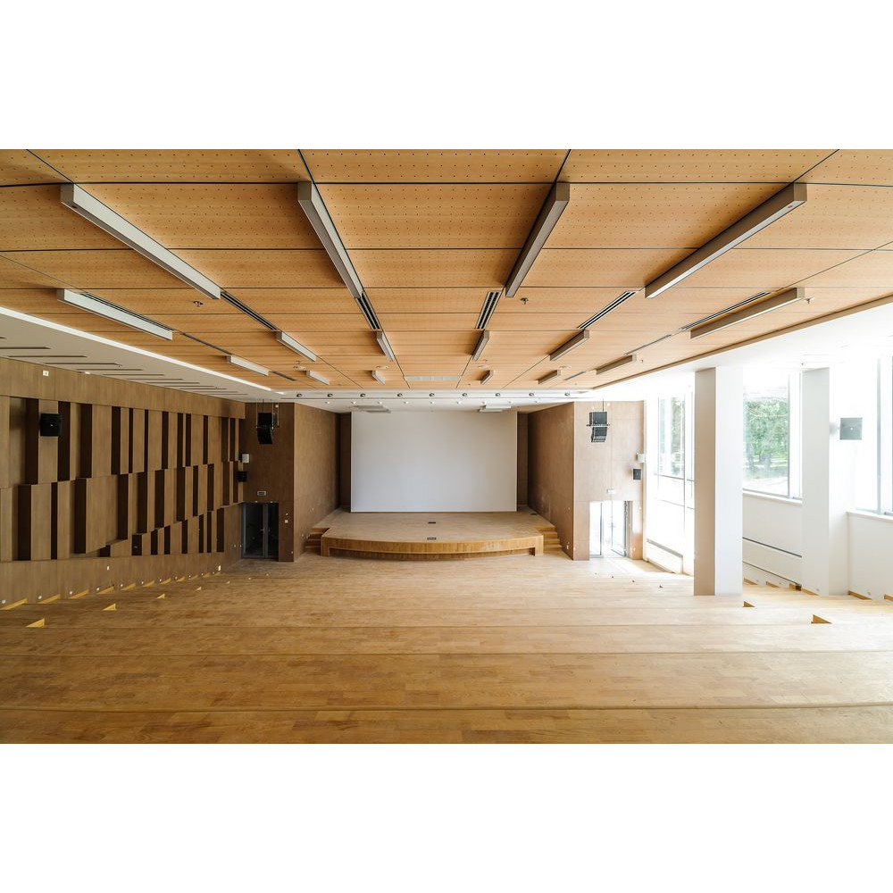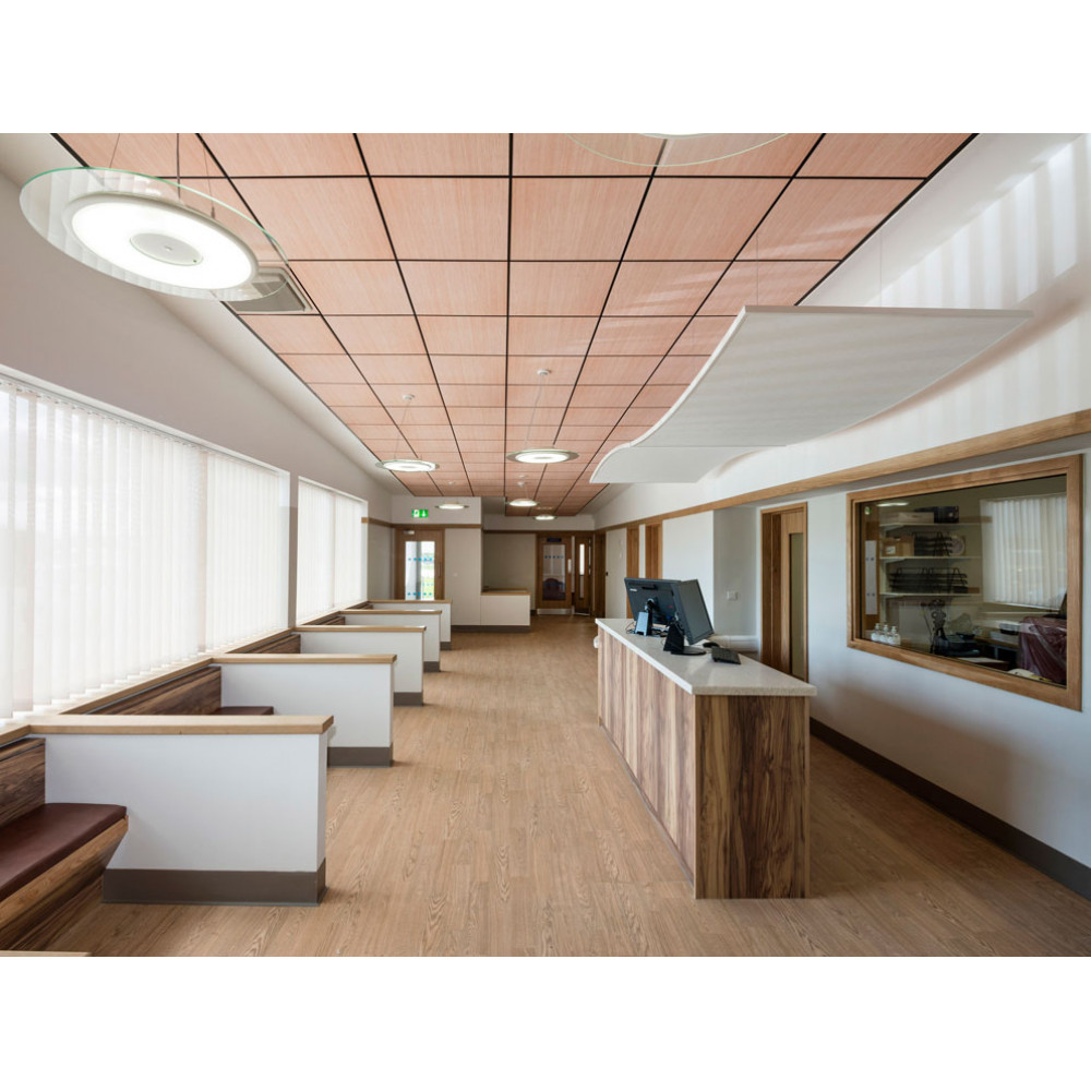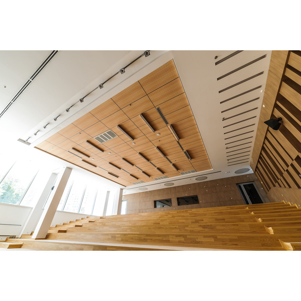 Плити AMF THERMATEX Varioline Wood Ash мають високі звукопоглинаючі властивості класу A, що робить їх ідеальними для використання в офісах, навчальних закладах, конференц-залах та інших приміщеннях, де важлива хороша акустика. Коефіцієнт звукопоглинання (NRC) становить 0.95, що забезпечує значне зменшення рівня шуму.