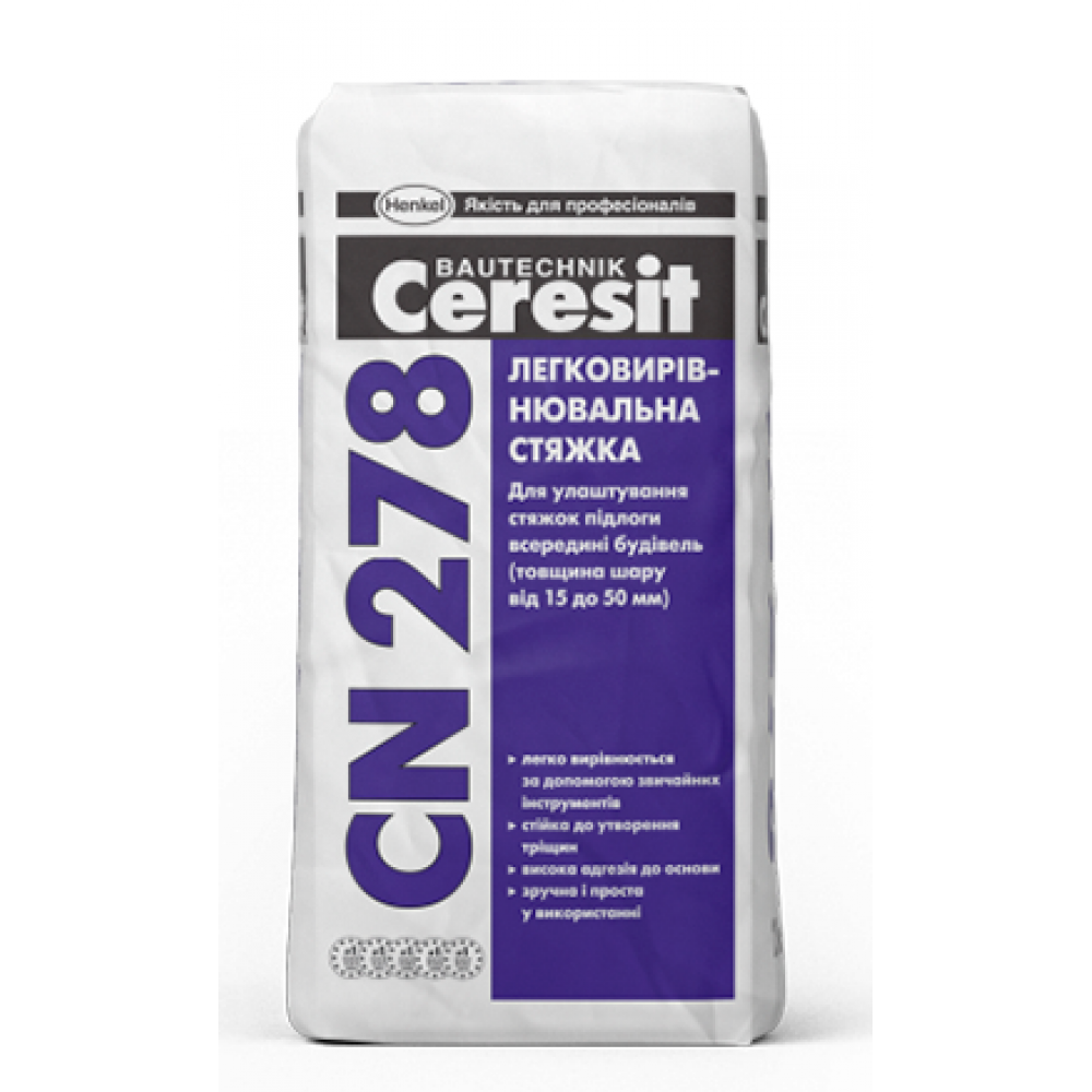 Легковиравнівающаяся стяжка Ceresit CN 278 призначена для влаштування стяжок підлоги по жорстких підставах, товщиною шару від 15 мм. Ceresit CN 278 може укладатися за роздільним шару (гідроізоляція, тепло-, звукоізоляція), в даному випадку товщина шару повинна розраховуватися залежно від жорсткості тепло-, звукоізоляційний матеріал і ступеня впливу механічних навантажень, мінімальний шар повинен бути не менше 40 мм. Ceresit CN 278 застосовується для вирівнювання і ремонту існуючих бетонних і цементно-піщаних стяжок. За шару Ceresit СN 278 можуть укладатися Легковиравнівающаяся суміші Ceresit CN 69 і Ceresit CN 72. Технологічні властивості розчинної суміші Ceresit CN 278 дозволяють підготувати її поверхню під укладання облицювальної плитки, ковроліну, лінолеуму.