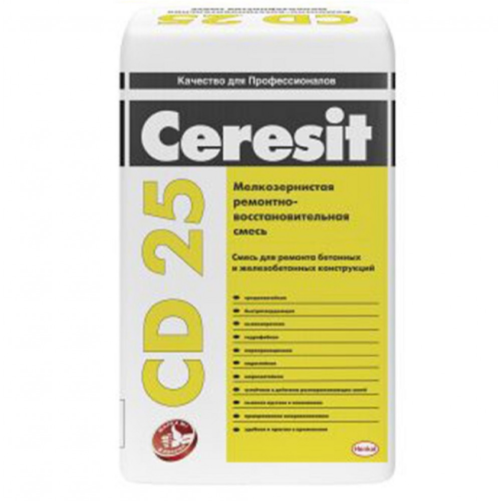 Суміш Ceresit СD 25 призначена для ремонту і відновлення бетонних і залізобетонних підстав, в тому числі об'єктів транспортного будівництва, що піддаються впливу навантажень РСС I, РСС II і РСС III. Ефективна при ремонті відколів, пустот, раковин, нерівностей та інших локальних дефектів на поверхні залізобетонних і бетонних підстав товщиною шару до 30 мм. Не застосовувати для вирівнювання і ремонту підстав з легкого бетону і підстав, схильних до значних механічних впливів. Ceresit СD 25 є складовим елементом системи відновлення і захисту бетону Ceresit ПЦБ. Застосовується при виконанні комплексних ремонтів бетонних і залізобетонних конструкцій, викликаних тривалою експлуатацією або руйнуваннями під впливом механічних навантажень і корозійних процесів & ndash; монолітні каркасні конструкції, підпірні стінки, резервуари (в тому числі для стічних вод), монолітні конструкції (в тому числі басейни), рампи, пандуси, колони, балкони і т. п.